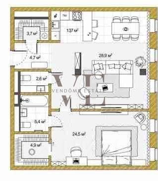 Оптимальный вариант организации пространства - гостиная-кухня, изолированная спальня, полноценный и гостевой санузлы. Возможность разместить отдельную комнату под рабочий кабинет или творческую мастерскую.