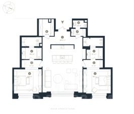 Планировочное решение: просторная кухня-гостиная-столовая, 2 спальни, каждая - с ванной комнатой, гардеробная, постирочная, гостевой с/у.