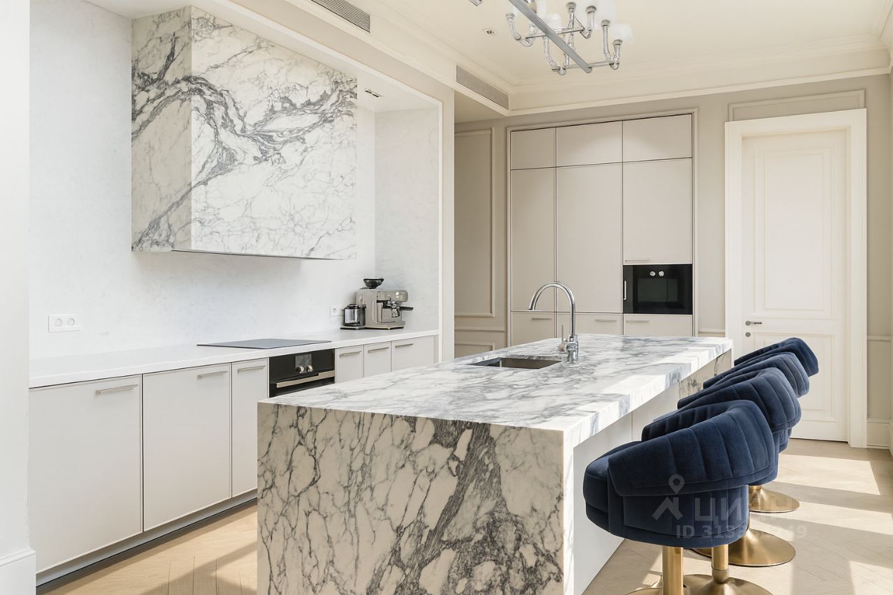 Ремонт выполнен в неоклассическом стиле исключительно из дорогих материалов (дубовая паркетная доска, итальянский мрамор, кварц, гипсовые карнизы индивидуального изготовления). Мебель Longhi, Rugiano. Кухня оборудована встроенной бытовой техникой Gaggenau, Liebher, в ванных комнатах сантехника Villeroy&Boch, Nicolazzi. Установлена система "Умный дом".