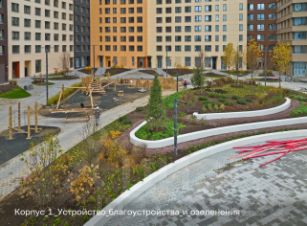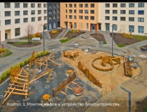 Cовременные игровые площадки c фонтанами. Спортивная площадка и велопарковки.