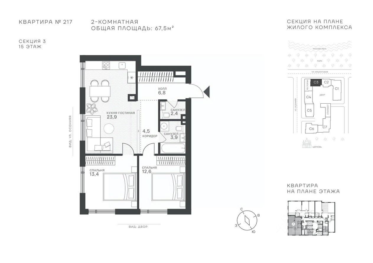 Успейте стать частью уникального проекта премиум-класса на западе Москвы! В продаже квартиры: 1-комнатные от 28,1 м²; 2-комнатные от 61,2 м²; 3-комнатные от 86,6 м²; 4-комнатные от 110,7 м². Первый взнос от 30%! Рассрочка на 2 года без переплат! Крылатское 33 это премиальный жилой комплекс от специализированного застройщика ООО "Сияние". Самый высокий небоскрёб в районе, достигающий отметки в 150 метров и малоэтажный клубный формат высотой от 42 метров на приватной территории площадью 1,4 га. Великолепные виды на излучину Москва-реки, Живописный мост и урбанистический облик города. Эксклюзивные форматы квартир с панорамным остеклением и патио-террасами. Двухуровневый паркинг на 271м/м, премиальные входные группы, ресторан высокой кухни, детский сад и эко-маркет на территории комплекса. Эксклюзивные преимущества: доступ к wellness-центру, коворкингу и клубной гостиной только для резидентов. Над проектом работали именитые российские архитектурные бюро: архитектор проекта бюро "Остоженка", планировочные решения от бюро Александры Федоровой. Расположение Пешком: 5-7 минут - до парка Звезд, Крылатского парка и набережной Москвы-реки; 15 минут - до метро Крылатское Арбатско-Покровской линии; 15 минут - до пристани Крылатская. На автомобиле: 10 минут - до Третьего транспортного кольца; 15 минут - до Садового кольца и Москва- Сити; 20-30 минут - до Аэропорта Внуково; 30-40 минут - до Аэропорта Шереметьево. В 300 метрах от комплекса - удобная транспортная развязка с проспектом Маршала Жукова, обеспечивающая легкий доступ к ключевым магистралям. Благоустройство: Просторная общественная гостиная; Коворкинг с кофе-баром, комфортные переговорные зоны с быстрым wi-fi, зарядными устройствами и библиотекой; Пространство friends lab для организации клубных мероприятий; Wellness-центр с фитнес-залом и массажными кабинетами; Ресторан высокой кухни; Частный детский сад; Детское кафе; Современный детский playhub; Спортивные площадки; Гипоаллергенный сад, безопасные водные пространства, декоративные пруды и сухие фонтаны; Высокоскоростные бесшумные лифты; Разделение зон для резидентов квартала и сервисного обслуживания. Окружение: - парки: Крылатские холмы, природно-исторический парк Москворецкий, Серебряный Бор; - учебные заведения: 5 образовательных комплексов, в которые входят 15 детских садов и 12 школьных корпусов. В удобной транспортной доступности гимназия им. Е. М. Примакова и международный лицей The International School of Moscow; - уникальные спортивные сооружения: гребной канал "Крылатское", легендарный велотрек "Крылатское", "Лата Трэк" для горнолыжников и сноубордистов, ледовый дворец "Крылатское"; - единственный в Москве парк развлечений под открытым небом, включающий более 70 вариантов досуга для любого возраста и времени года. Срок сдачи проекта: 2 квартал 2027 года. Финансирование и эскроу-счет обеспечены банком МКБ.