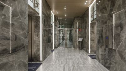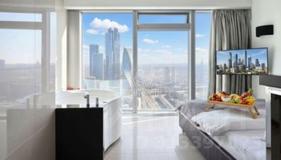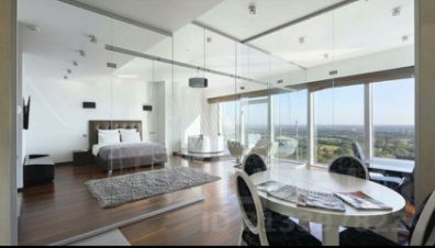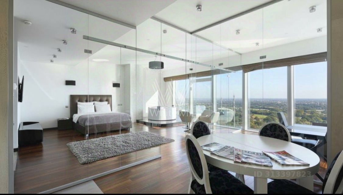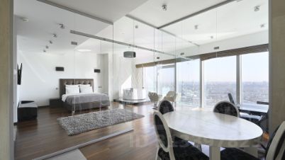 Помещение с панорамным остеклением разделено на два обособленных апартамента площадью 66 м² и 38 м². Апартаменты расположены на сорок восьмом этаже в башне "Санкт-Петербург".