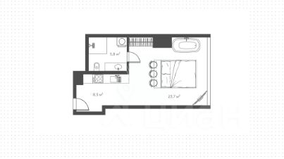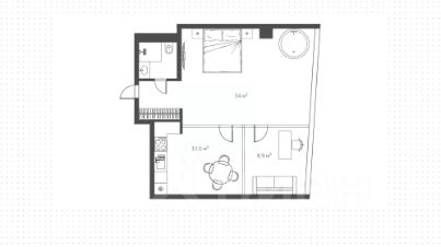 Планировка апартаментов площадью 38 м²: кухня-столовая, спальня с джакузи у панорамного окна, санузел, прихожая. Из окон открываются живописные виды на город и Москву-реку.