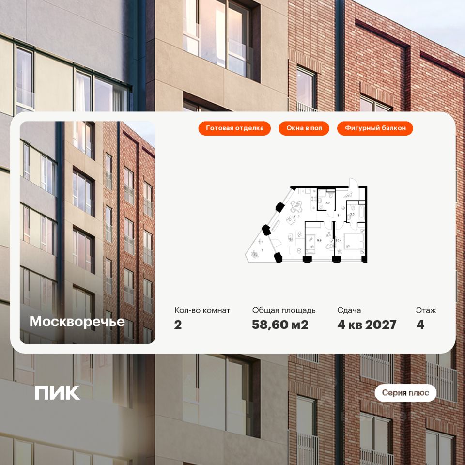 Продаётся 2-комн. квартира площадью 58,6 кв.м на 4 этаже 39 этажного дома (Корпус 1.3, Секция 4) проекта ПИК Москворечье. Светлый просторный подъезд на уровне земли, функциональная планировка, большие окна, c отделкой.