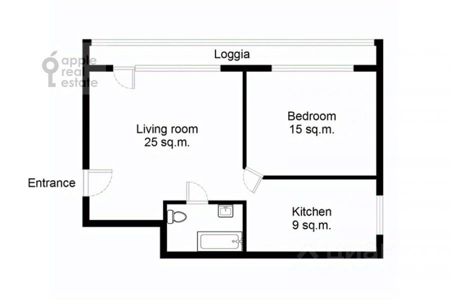 Функциональная планировка: гостиная, кухня, спальня, совмещенный санузел, большая лоджия.
