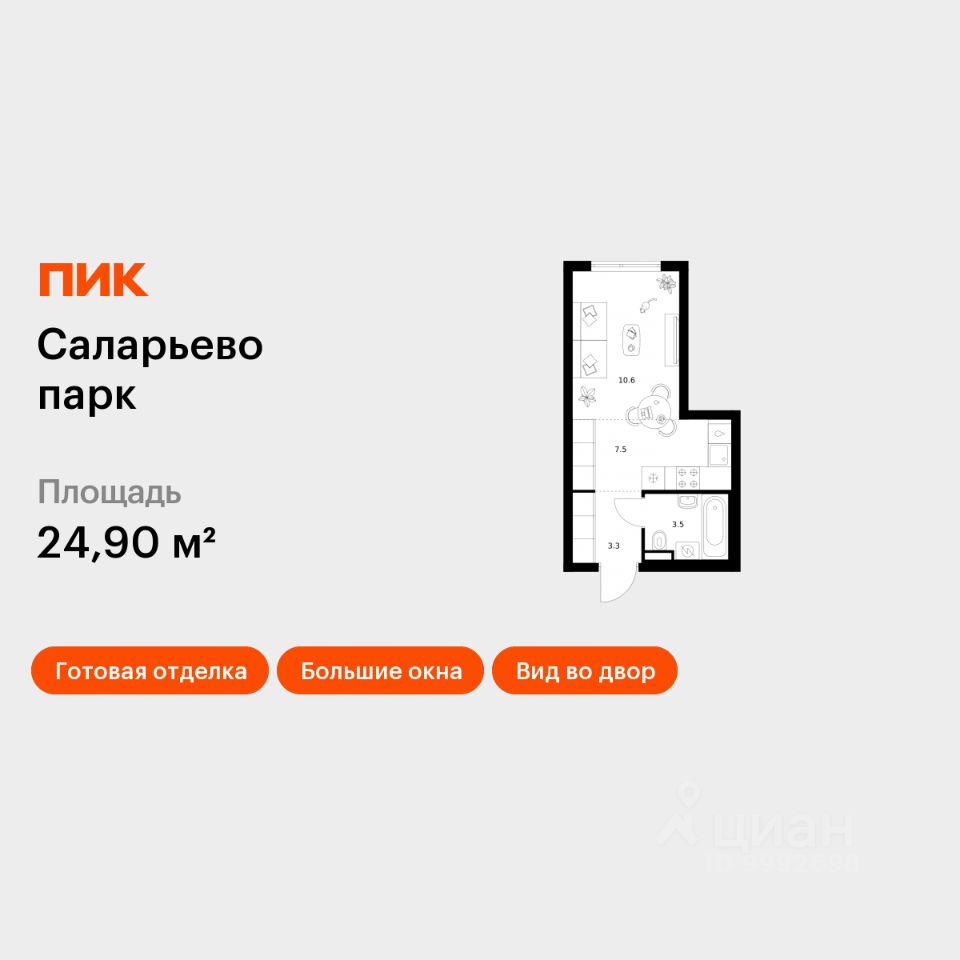 Продаётся квартира-студия площадью 24,9 кв.м на 18 этаже 18 этажного дома (Корпус 74.1, Секция 1) проекта ПИК Саларьево парк. Светлый просторный подъезд на уровне земли, функциональная планировка, большие окна, c отделкой.