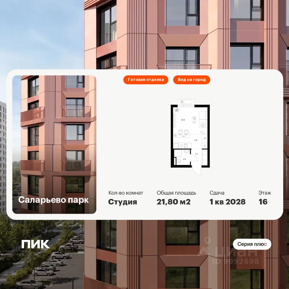 Продаётся квартира-студия площадью 21,8 кв.м на 16 этаже 16 этажного дома (Корпус 74.7, Секция 7) проекта ПИК Саларьево парк. Светлый просторный подъезд на уровне земли, функциональная планировка, большие окна, c отделкой.