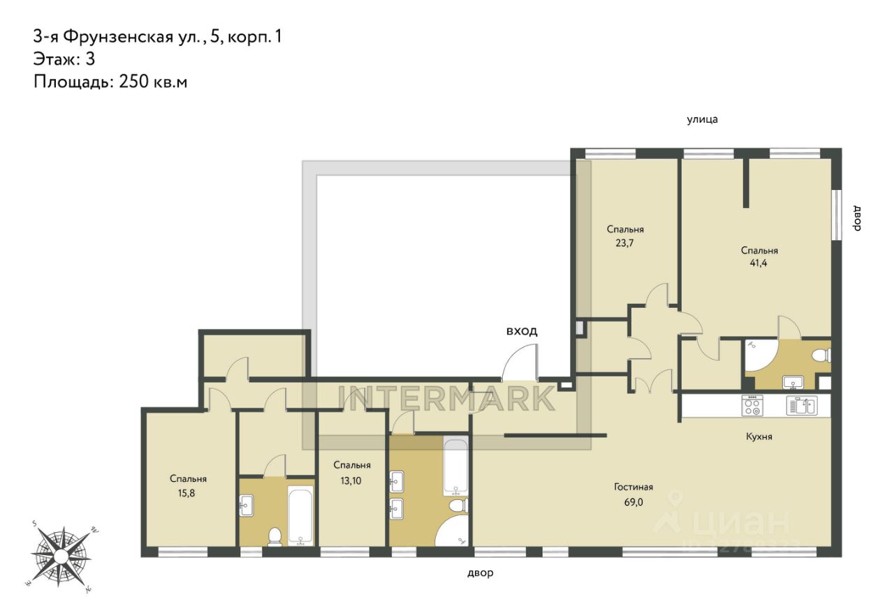 ID 63394: ЖК Спорт Хаус. Просторная 5-ти квартира в ЖК Спорт Хаус на Фрунзенской. Без отделки. Панорамные окна. Потолки 3,2 м.