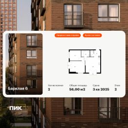 Продаётся 2-комн. квартира площадью 56 кв.м на 2 этаже 32 этажного дома (Корпус 8, Секция 3) проекта ПИК Барклая 6. Светлый просторный подъезд на уровне земли, функциональная планировка, большие окна, предчистовая отделка.