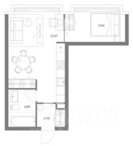 Просторная и функциональная планировка спальня, кухня-гостиная, прихожая, гардеробная и санузел.