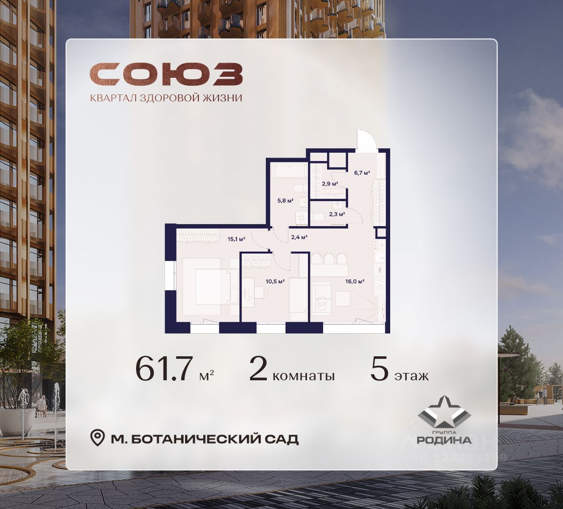 Продаётся 2-комнатная квартира площадью 61.7 м² на 5 этаже в Жилом Комплексе "Союз".