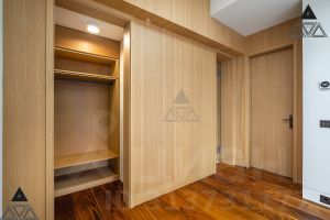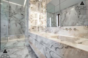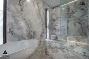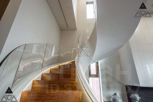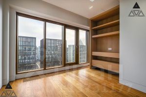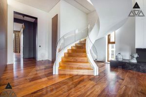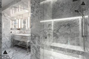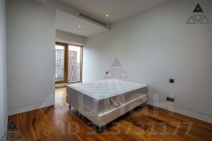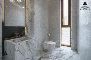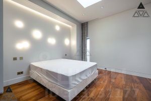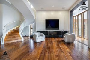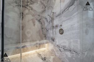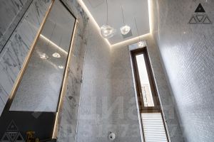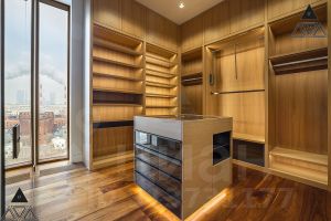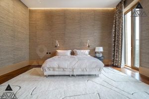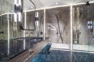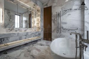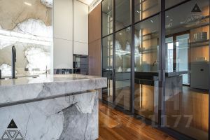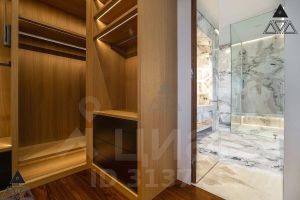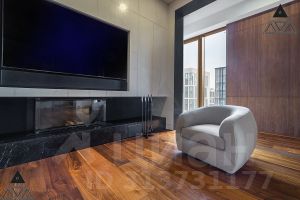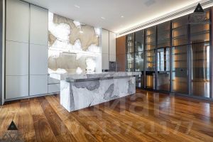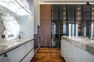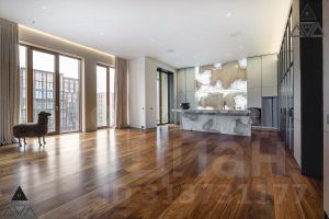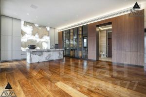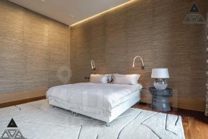 Интерьер выполнен в современном стиле с использованием элитных материалов, таких как ценные породы дерева и натуральный камень. В помещении установлена мебель, бытовая техника и сантехника премиальных брендов.