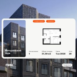 Продаётся 1-комн. квартира площадью 31,3 кв.м на 28 этаже 31 этажного дома (Корпус 4.3, Секция 2) проекта ПИК Мичуринский парк. Светлый просторный подъезд на уровне земли, функциональная планировка, большие окна, c отделкой.