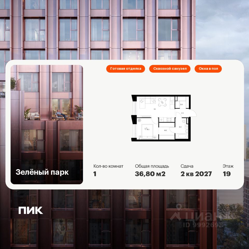 Продаётся 1-комн. квартира площадью 36,8 кв.м на 19 этаже 28 этажного дома (Корпус 6.6, Секция 5) проекта ПИК Зелёный парк. Светлый просторный подъезд на уровне земли, функциональная планировка, большие окна, c отделкой.