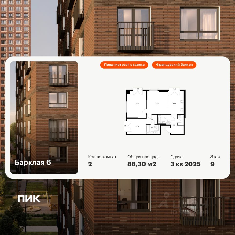 Продаётся 2-комн. квартира площадью 88,3 кв.м на 9 этаже 32 этажного дома (Корпус 6, Секция 1) проекта ПИК Барклая 6. Светлый просторный подъезд на уровне земли, функциональная планировка, большие окна, предчистовая отделка.