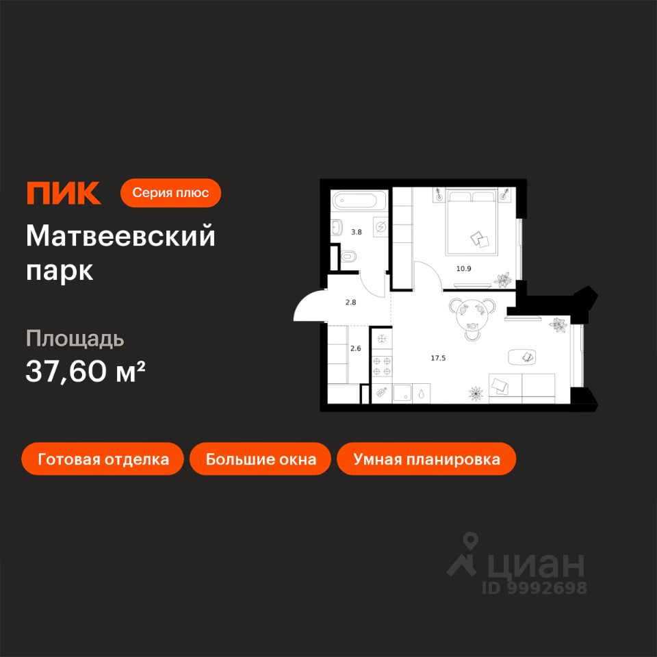 Продаётся 1-комн. квартира площадью 37,6 кв.м на 2 этаже 13 этажного дома (Корпус 4.5, Секция 3) проекта ПИК Матвеевский парк. Светлый просторный подъезд на уровне земли, функциональная планировка, большие окна, c отделкой.