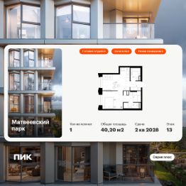 Продаётся 1-комн. квартира площадью 40,2 кв.м на 13 этаже 13 этажного дома (Корпус 4.4, Секция 1) проекта ПИК Матвеевский парк. Светлый просторный подъезд на уровне земли, функциональная планировка, большие окна, c отделкой.