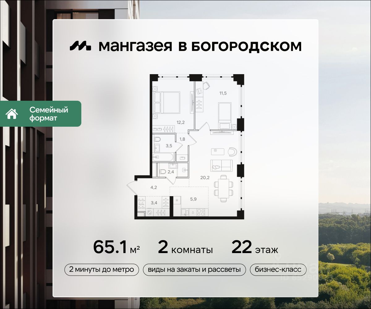 Предлагается квартира площадью 65.10 кв. м в новом современном квартале на востоке Москвы, прямо у станций метро и МЦК "Бульвар Рокоссовского". Квартира располагается в корпусе 5 на 22 этаже комплекса бизнес-класса "Мангазея в Богородском".