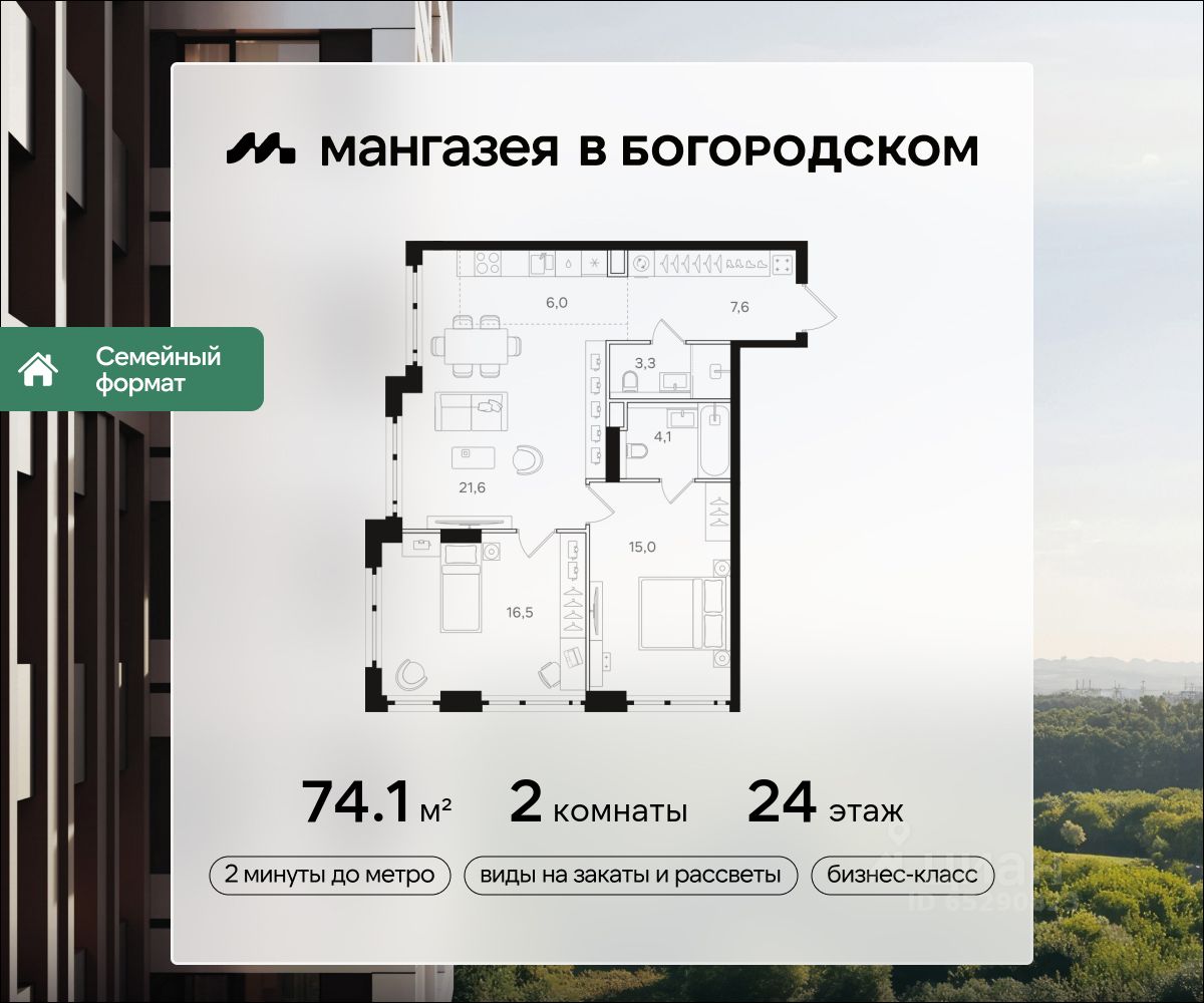 Предлагается квартира площадью 74.10 кв. м в новом современном квартале на востоке Москвы, прямо у станций метро и МЦК "Бульвар Рокоссовского". Квартира располагается в корпусе 5 на 24 этаже комплекса бизнес-класса "Мангазея в Богородском".