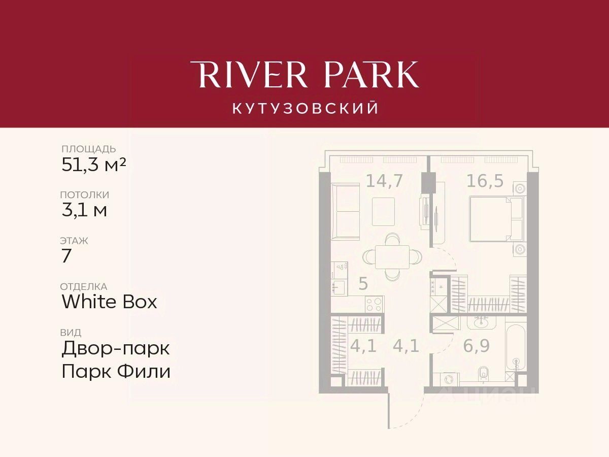 Продается 1-к квартира площадью 51.3 кв.м. на 7-м этаже в жилом комплексе премиум-класса River Park Кутузовский в Башне Emerald Tower