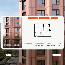 Продаётся 2-комн. квартира площадью 55,4 кв.м на 18 этаже 18 этажного дома (Корпус 74.9, Секция 9) проекта ПИК Саларьево парк. Светлый просторный подъезд на уровне земли, функциональная планировка, большие окна, c отделкой.