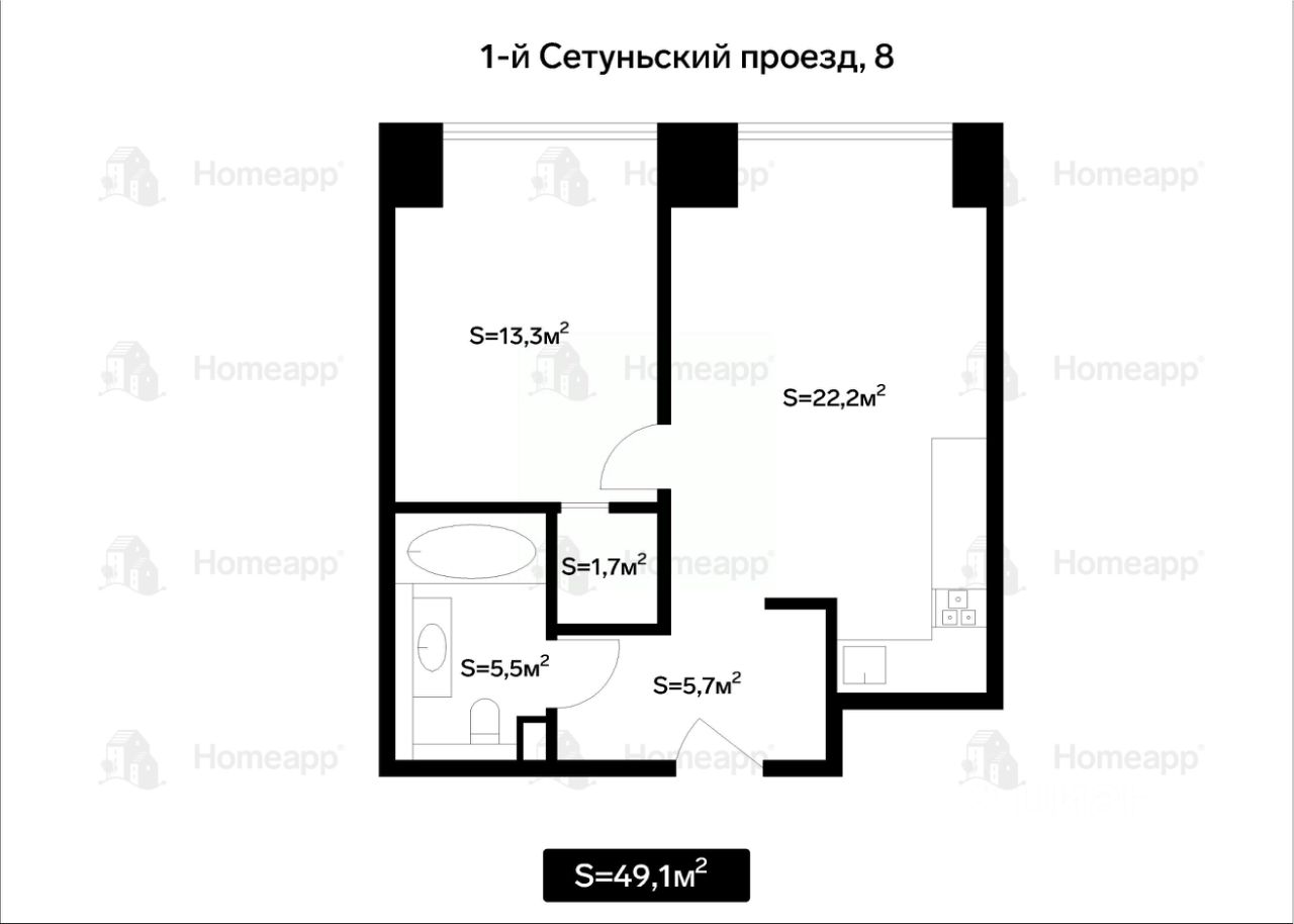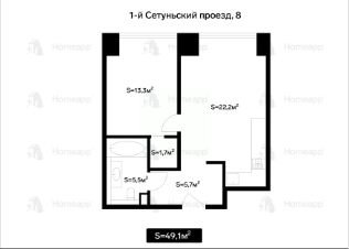 Планировка: просторная кухня-гостиная 22,2 м², спальня 13,3 м², ванная комната 5,5 м² и холл 5,7 м². Уже разработан дизайн-проект со всеми расчетами.