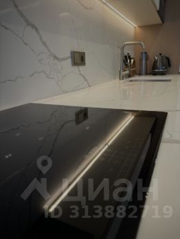 - В кухне-гостиной установлена из натурального дуба кухня со встроенной немецкой техникой BOSCH, столешница и кухонный фартук из цельного кварцевого агломерата с подбором рисунка;