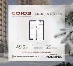 Продаётся 1-комнатная квартира площадью 49.3 м² на 20 этаже в Жилом Комплексе "Союз".