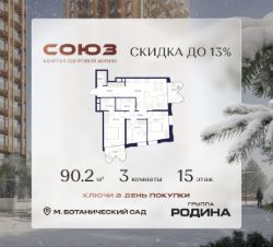 Продаётся 3-комнатная квартира площадью 90.2 м² на 15 этаже в Жилом Комплексе "Союз".
