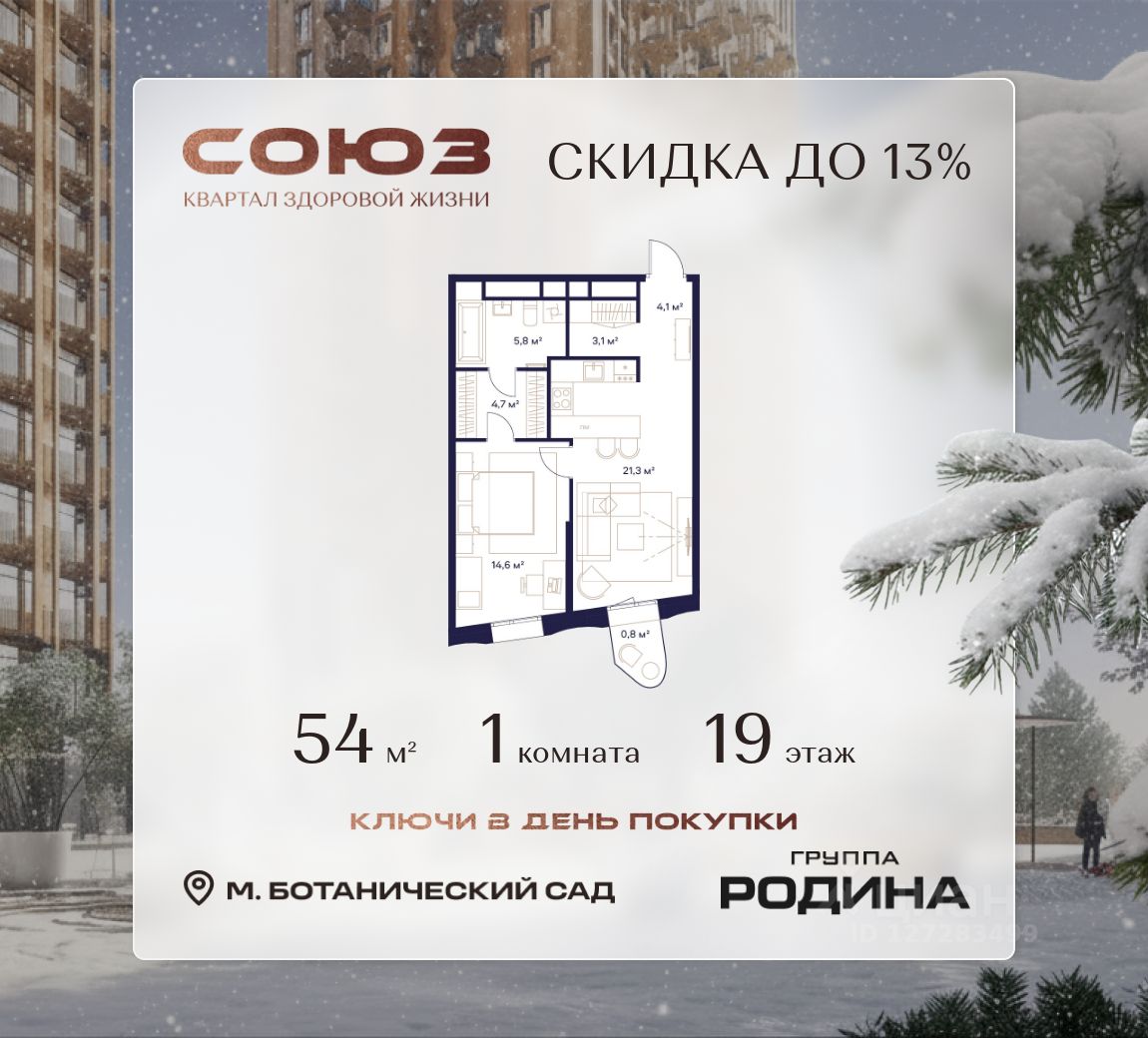 Продаётся 1-комнатная квартира площадью 54 м² на 19 этаже в Жилом Комплексе "Союз".