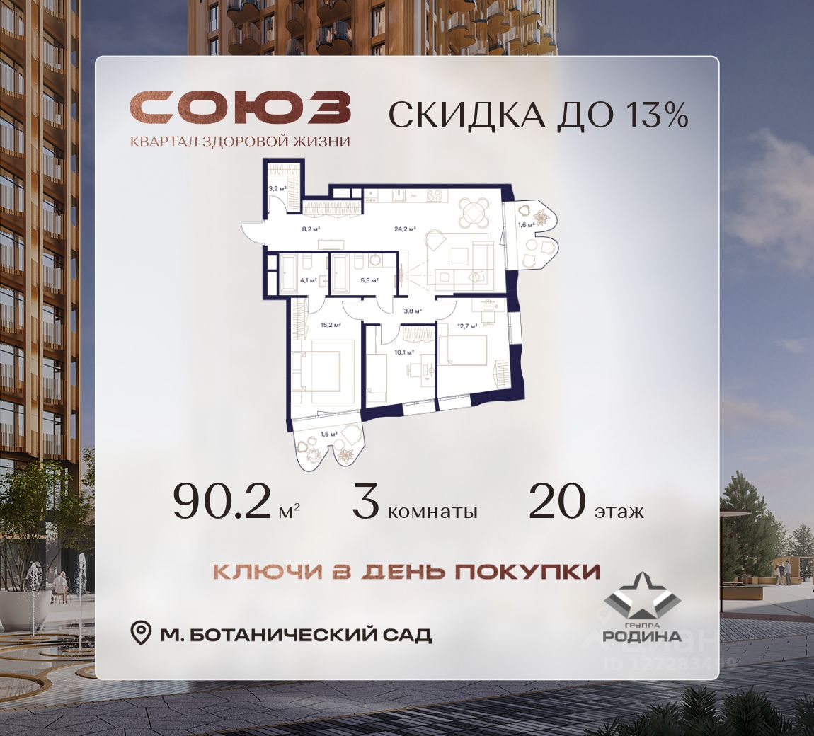 Продаётся 3-комнатная квартира площадью 90.2 м² на 20 этаже в Жилом Комплексе "Союз".