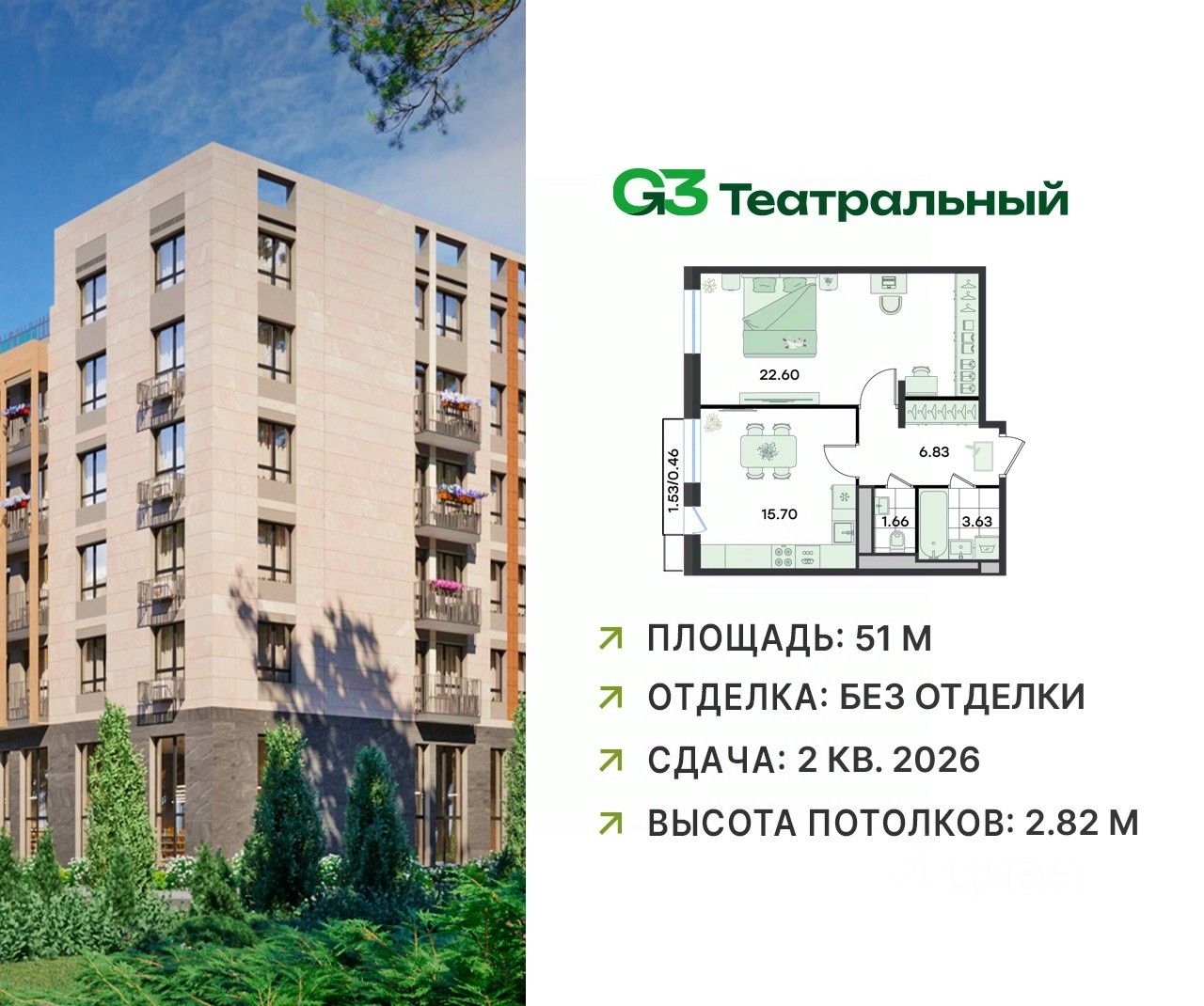 В современном квартале бизнес-класса G3 Театральный продаётся 1-комнатная квартира, общей площадью 51 кв.м, расположенная на 2 этаже (корпус 2, секция 1).