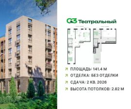 В современном квартале бизнес-класса G3 Театральный продаётся 3-комнатная квартира, общей площадью 141.4 кв.м, расположенная на 5 этаже (корпус 2, секция 3).
