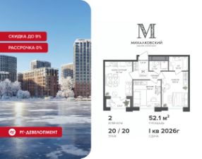 Продаётся 2-к квартира 52,1 кв.м. в ЖК "Михалковский" на 20-м этаже 20 этажного дома.