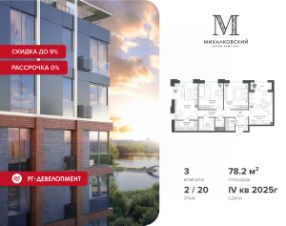 Продаётся 3-к квартира 78,2 кв.м. в ЖК "Михалковский" на 2-м этаже 20 этажного дома.