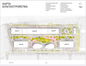 Инфраструктура: торговые и коммерческие помещения, ресторан, закрытый двор со спортивными детскими площадками, прогулочными дорожками и фонтанами, образовательный центр и детский сад.