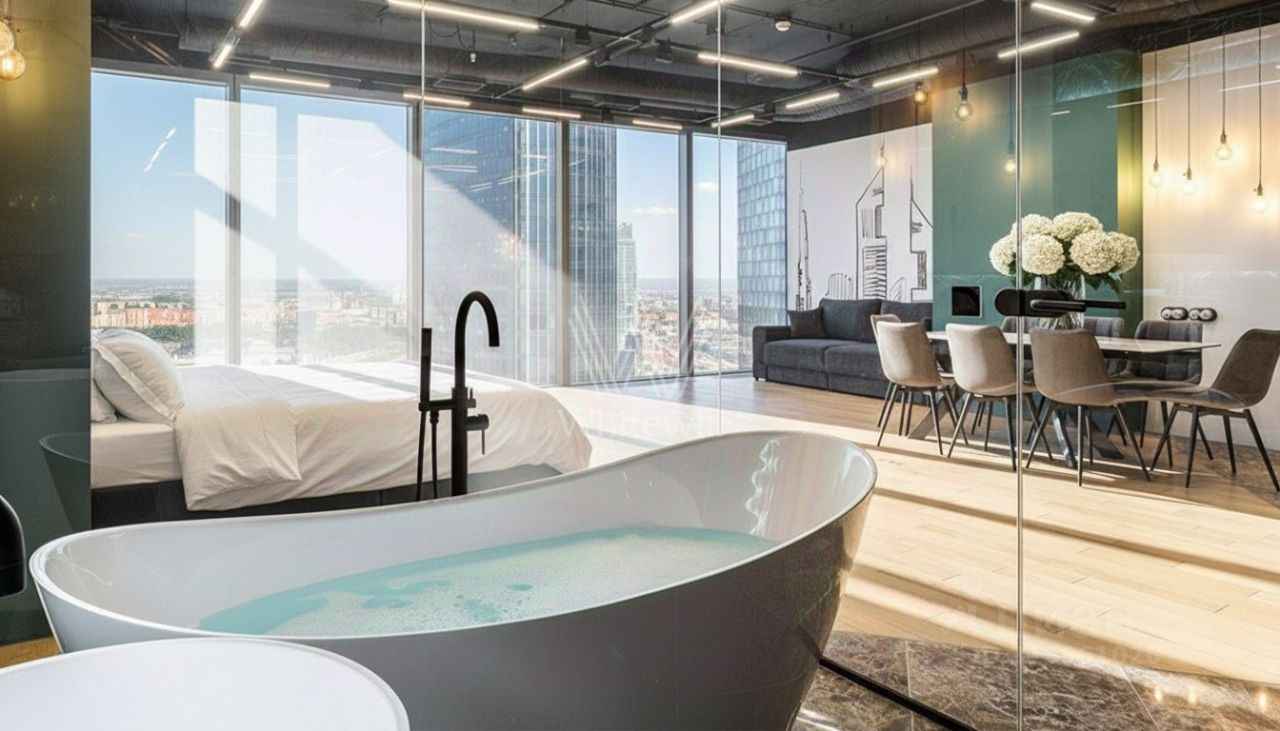 Видовые апартаменты Space в комплексе бизнес-класса "Федерация". Апартаменты общей площадью 78 м² расположены в башне "Восток" на 72-м этаже. Выполнена отделка с использованием натуральных материалов. В апартаменте никто не проживал. Установлена система вентиляции и очистки воздуха. Просторная студия включает зону кухню-гостиной и спальни, ванную комнату, постирочную, гардеробную и холл. Апартамент укомплектован мебелью и бытовой техникой. Из окон открываются виды на город в сторону Парка Победы.