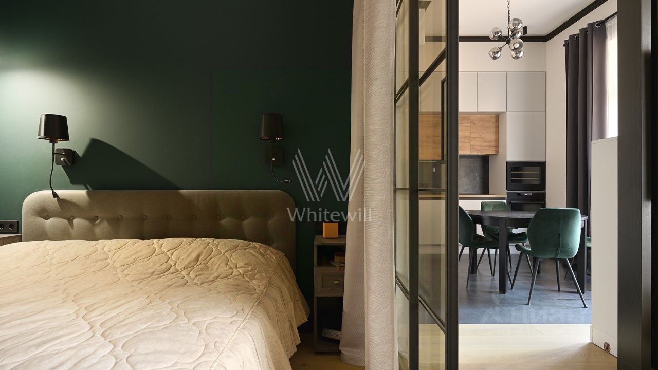 Квартира с одной спальней в комплексе "Клубный дом на Арбате". Квартира площадью 52 м² и просторной лоджией 15,4 м² расположена на втором этаже. Выполнена дизайнерская отделка в современном стиле с использованием премиальных материалов. Функциональная планировка включает гостиную, кухню, спальню со своим санузлом, гостевой санузел, лоджия и прихожую. Квартира укомплектована мебелью и бытовой техникой. Из окон открываются виды в благоустроенный двор.