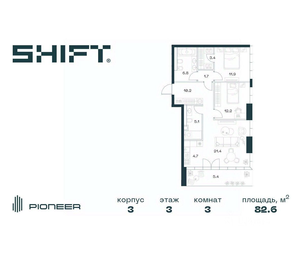 3-к квартира в премиальном комплексе SHIFT на 3-м этаже в 18 этажном здании. Общая площадь 82.6 кв. м.