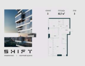 3-к квартира в премиальном комплексе SHIFT на 3-м этаже в 18 этажном здании. Общая площадь 82.7 кв. м.