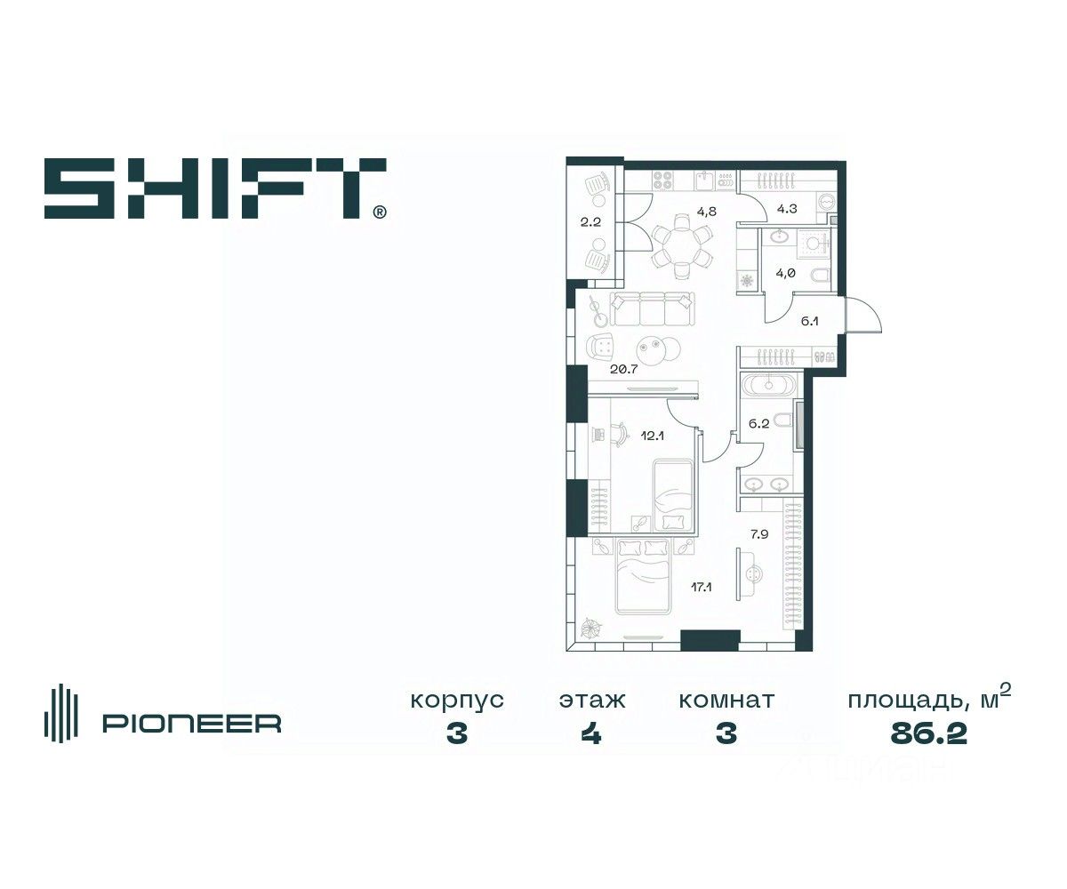 3-к квартира в премиальном комплексе SHIFT на 4-м этаже в 18 этажном здании. Общая площадь 86.2 кв. м.