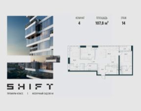 4-к квартира в премиальном комплексе SHIFT на 14-м этаже в 18 этажном здании. Общая площадь 107.8 кв. м.
