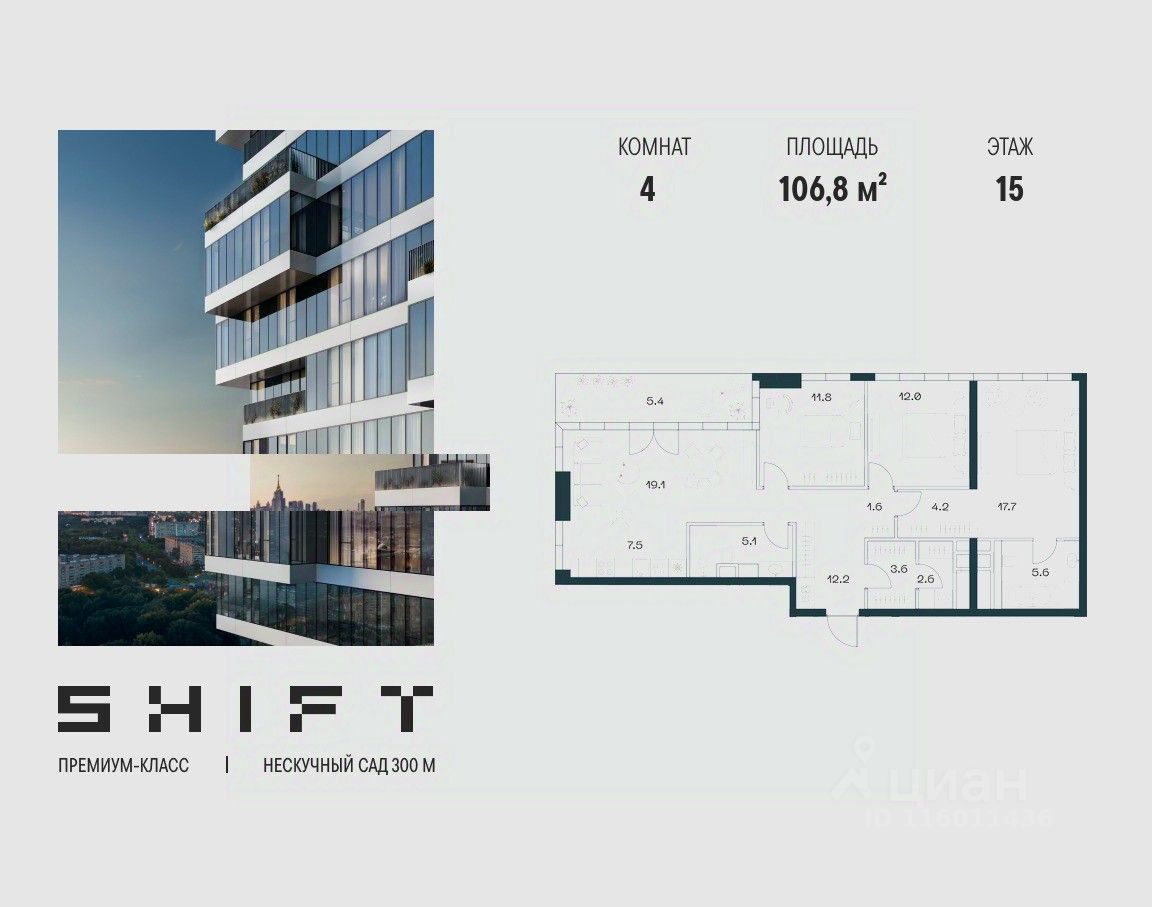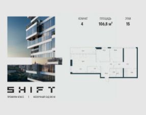 4-к квартира в премиальном комплексе SHIFT на 15-м этаже в 18 этажном здании. Общая площадь 106.8 кв. м.