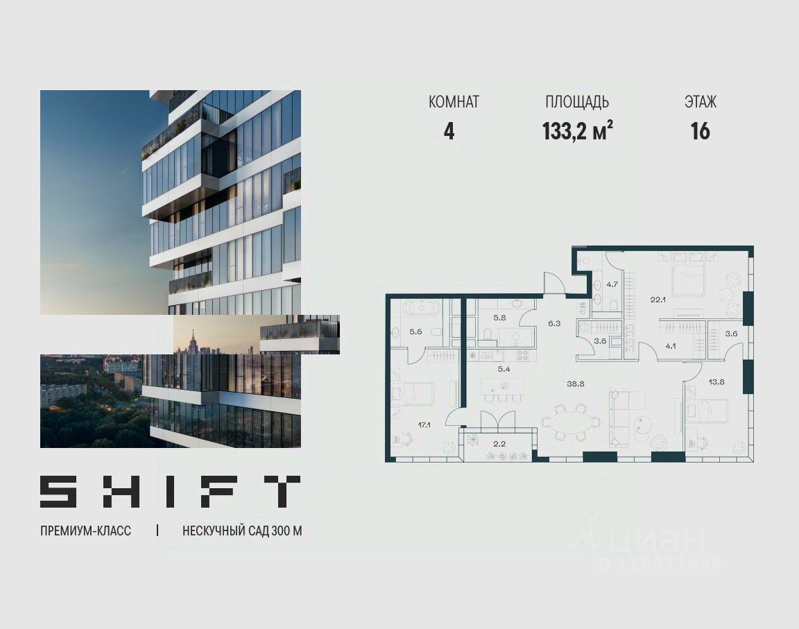 4-к квартира в премиальном комплексе SHIFT на 16-м этаже в 18 этажном здании. Общая площадь 133.2 кв. м.