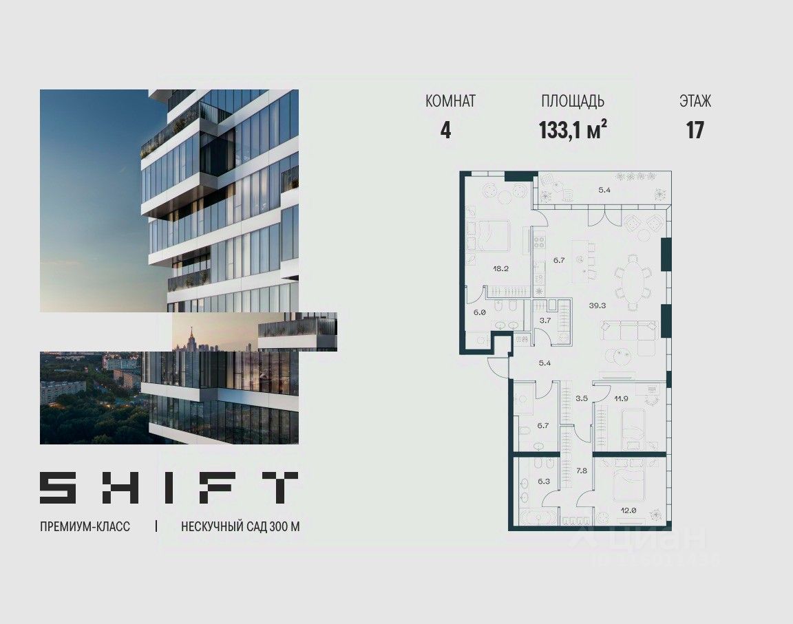 4-к квартира в премиальном комплексе SHIFT на 17-м этаже в 18 этажном здании. Общая площадь 133.1 кв. м.
