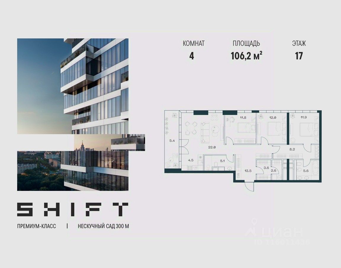 4-к квартира в премиальном комплексе SHIFT на 17-м этаже в 18 этажном здании. Общая площадь 106.2 кв. м.