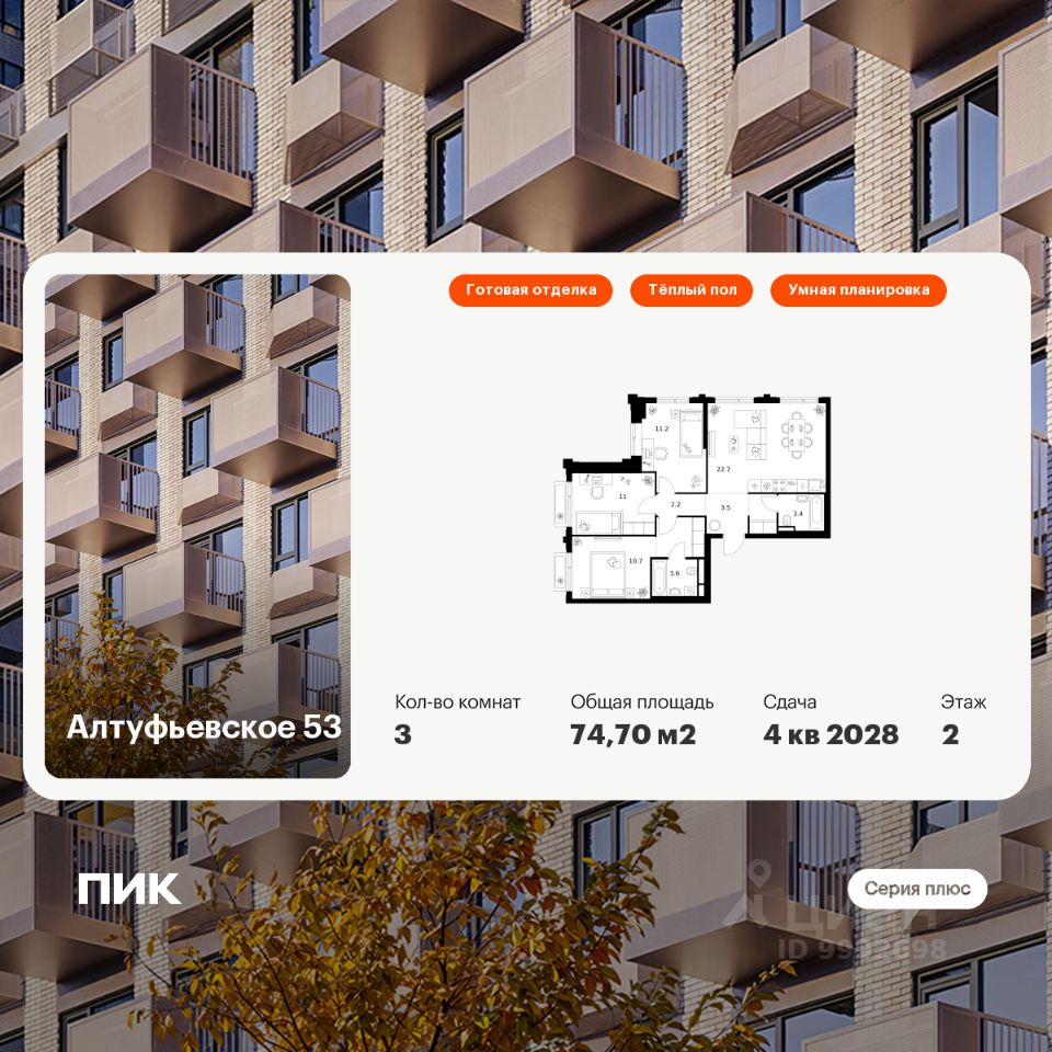 Продаётся 3-комн. квартира площадью 74,7 кв.м на 2 этаже 32 этажного дома (Корпус 1.1, Секция 4) проекта ПИК Алтуфьевское 53. Светлый просторный подъезд на уровне земли, функциональная планировка, большие окна, c отделкой.