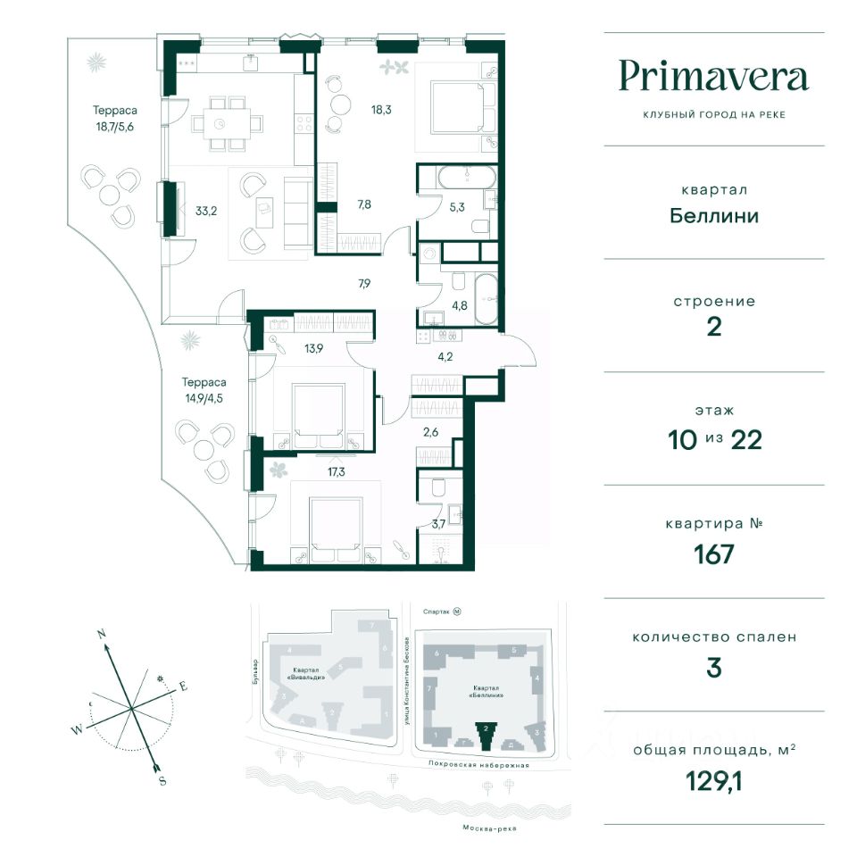 Клубный город на реке Primavera — это современный жилой комплекс премиум-класса, расположенный на первой береговой линии Москвы-реки в экологически чистом районе Покровское-Стрешнево. Под панорамными окнами квартир находится собственный экопарк с продуманной сетью прогулочных дорожек и современными детскими и спортивными площадками. За парком расположена набережная с собственным пляжем и зонами для отдыха. Клубный город на реке Primavera предлагает широкий выбор планировок для различных жизненных сценариев: от просторных однокомнатных квартир до пентхаусов и жилых помещений с террасами и патио. Выберите из 120 вариантов эргономичных планировок стандартного и евроформата. Из каждой квартиры открываются красивые виды на реку с углом обзора в 270 градусов. Дизайнерские лобби предлагают панорамный обзор на благоустроенный двор. Высокие потолки в 6 метров и качественная отделка создают атмосферу, схожую с пятизвездочными отелями. В Primavera есть всё необходимое для комфортной жизни в мегаполисе: • Образование для детей в шаговой доступности: 4 школы, 8 детских садов и развивающие центры с кружками и секциями. • Удобства на расстоянии приятной прогулки: супермаркеты, кафе, рестораны с верандами, салоны красоты, аптеки и многофункциональный центр для шоппинга и развлечений. • Умный дом: автоматизированное бесконтактное управление основными системами доступа и безопасности через мобильное приложение. Клубный город на реке Primavera выгодно сочетает комфорт городской жизни с близостью к природе. Живите в месте, где все создано для вашего удобства!