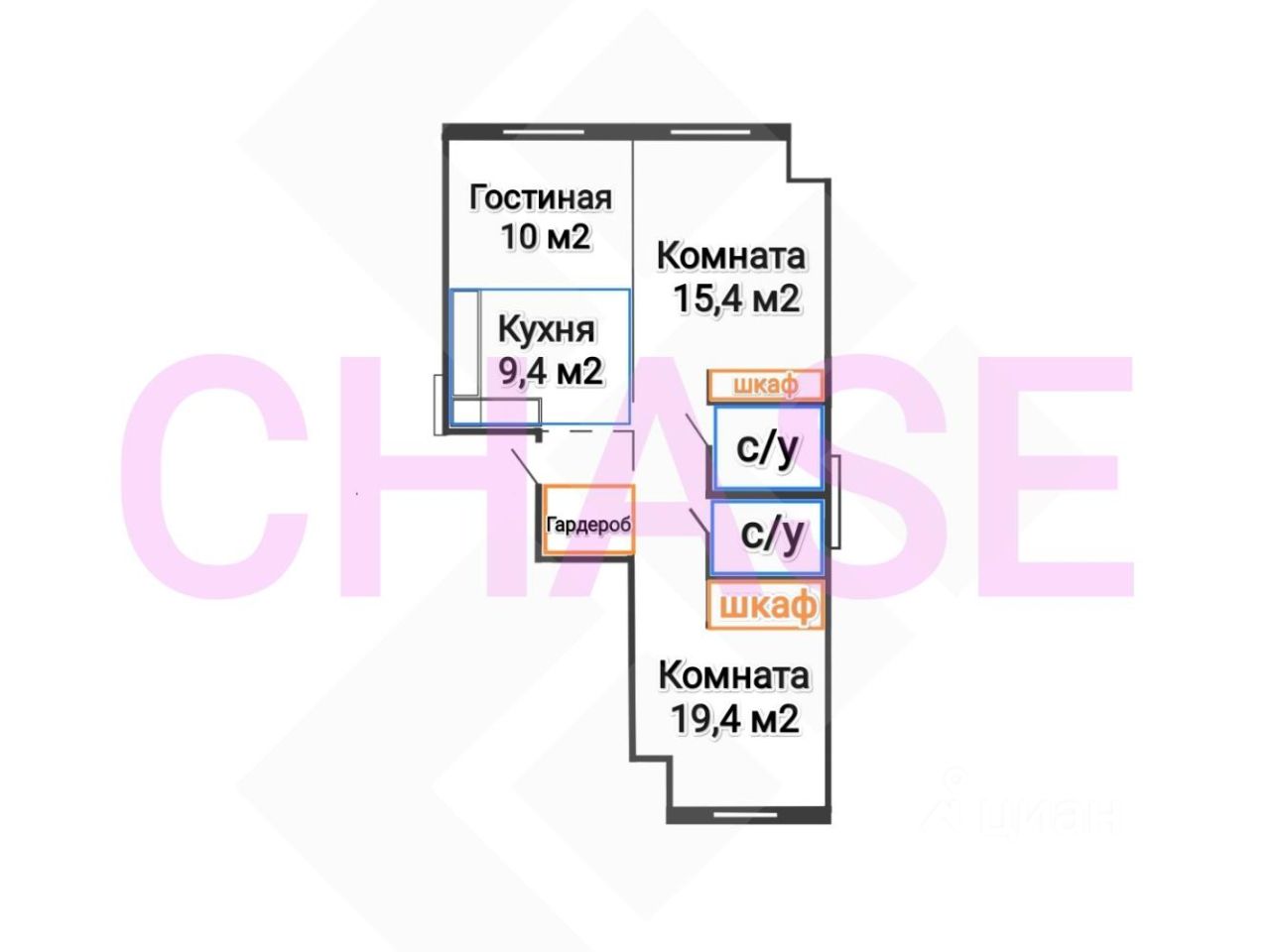 Планировка квартиры Евро_3 предусматривает 2 изолированные комнаты по 15,4 - 19,4 м2, гостиную 10 м2 и кухню 9,4 м2