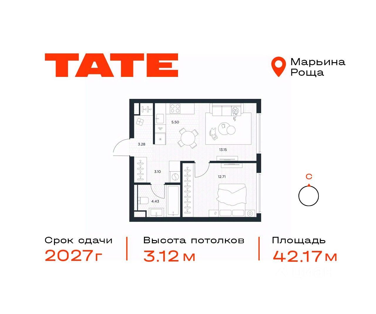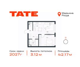 Продаётся 1-комнатная квартира от застройщика в ЖК премиум-класса TATE на 22 этаже. Общая площадь 42,17 м². Отделка предчистовая (white box). Башня В.